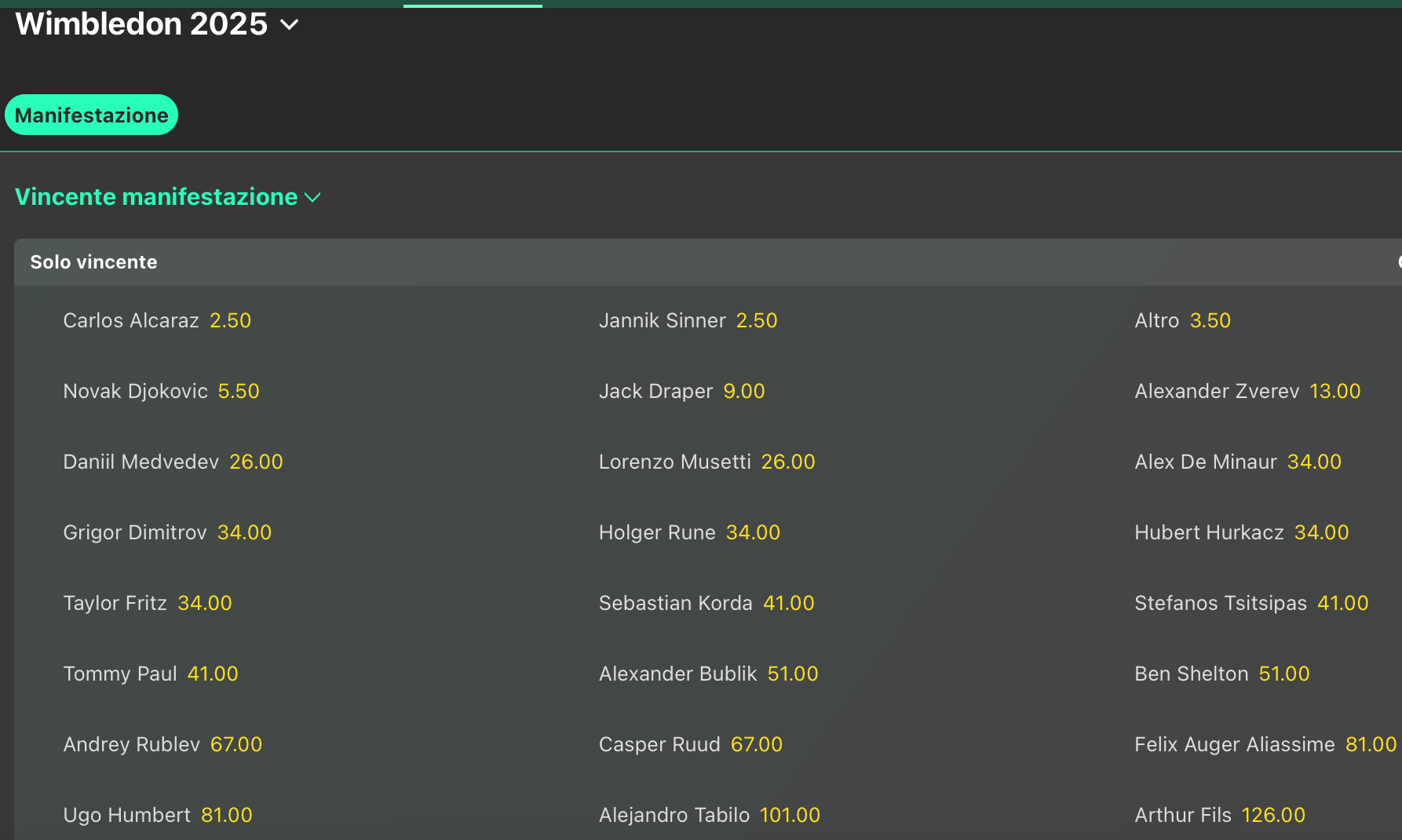 Tutta l’Inghilterra tiferà Jack Draper, numero 4 del mondo e londinese doc, pronto a raccogliere l’eredità lasciata da Andy Murray, ultimo suddito di Sua Maestà a vincere il torneo: l’impresa di Draper pagherebbe @9 volte la posta. Molto complessa la strada sia per Alexander Zverev, in quota @25 e mai andato oltre il quarto turno, che per Lorenzo Musetti, semifinalista lo scorso anno e in un grande momento di forma (semifinale anche a Parigi) e offerto @33.