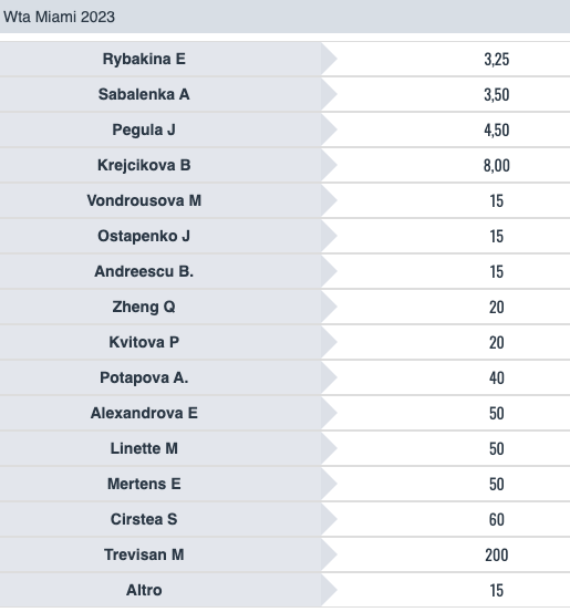Ecco le quote antepost per la vittoria finale nel tabellone femminile con una lavagna rivoluzionata dopo l’uscita della favorita Iga Swiatek. Ora in testa alle lavagne spicca la Rybakina @3.25 su Sabalenka @3.50. Pegula terzo incomodo @4.50 mentre il successo della nostra Trevisan rimane un opzione davvero difficile e quotata @200 volte la posta.