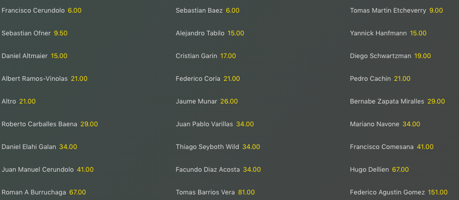 Luciano Darderi, Marco Cecchinato e Andrea Giannessi saranno a Cordoba per quest’altro ATP 250 dove le quote premiano due giocatori su tutti, Francisco Cerundolo e Sebastian Baez (il campione in carica) entrambi quotati da favoriti @6 volte la posta, davanti a Tomas Martin Etcheverry.