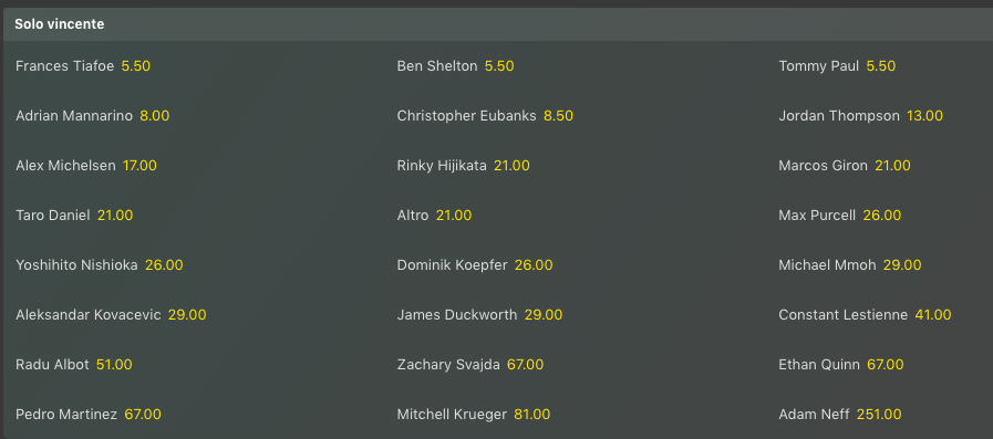 Nessun italiano negli States dove si gioca l’ATP 250 di Dallas. Qui a staccare tutti abbiamo i giocatori di casa: Frances Tiafoe, Ben Shelton e Tommy Paul, tutti quotati @5.50 davanti ad Adrian Mannarino @8 e a Christopher Eubanks @8.50.
