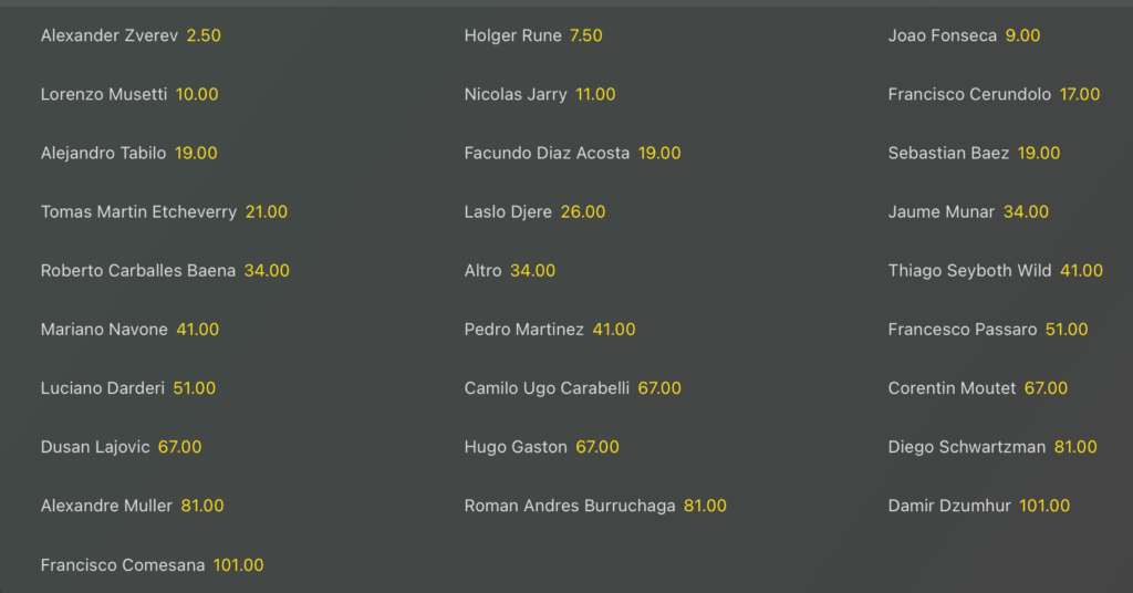 Sulla terra rossa argentina si gioca l’ATP 250 Buenos Aires che vede Alexander Zverev l’uomo da battere in quota @2.50, con Holger Rune che si presenta come principale antagonista del tedesco, anche se lontano @7.50 volte la posta, poi si sale con Joao Fonseca @9 e col nostro Lorenzo Musetti @10 che all’orizzonte vede una possibile semifinale proprio contro il numero #2 al mondo tedesco.