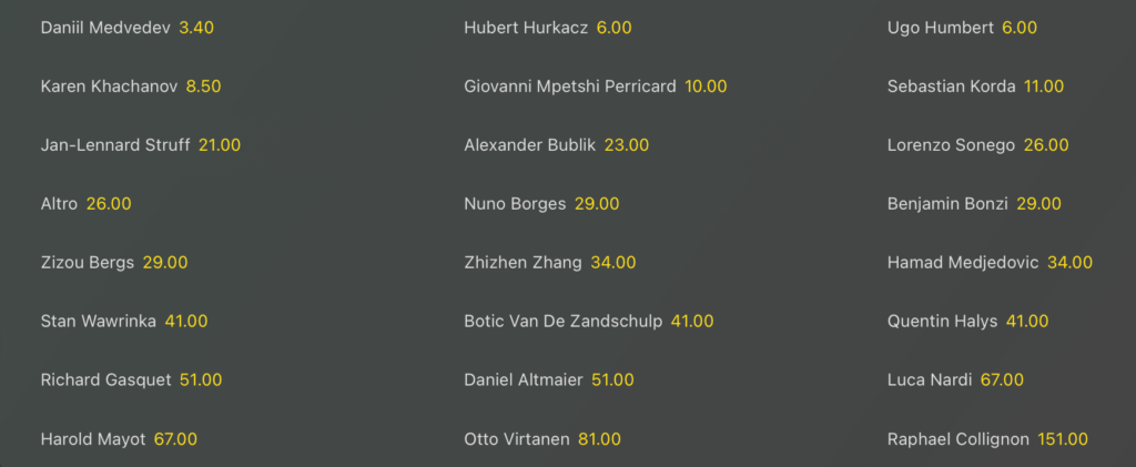 Lorenzo Sonego scende in campo già oggi contro l’olandese Botic Van de Zandschulp, ed è anche il migliore dei nostri in lavagna, con quota @26 volte la posta per le quote antepost della vittoria finale. Nel main draw francese c’è spazio anche per Luca Nardi, contrapposto al tedesco Daniel Altmaier al primo turno, e quotato @67 per la vittoria finale del torneo.