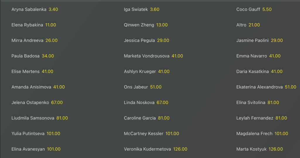 La toscana è iscritta anche al torneo di doppio in Qatar insieme a Sara Errani mentre nel singolare è quotata @29 per la vittoria finale dove spicca Aryna Sabalenka @3.60 con Iga Swiatek vicinissima @3.60, poi abbiamo Coco Gauff @5.50.