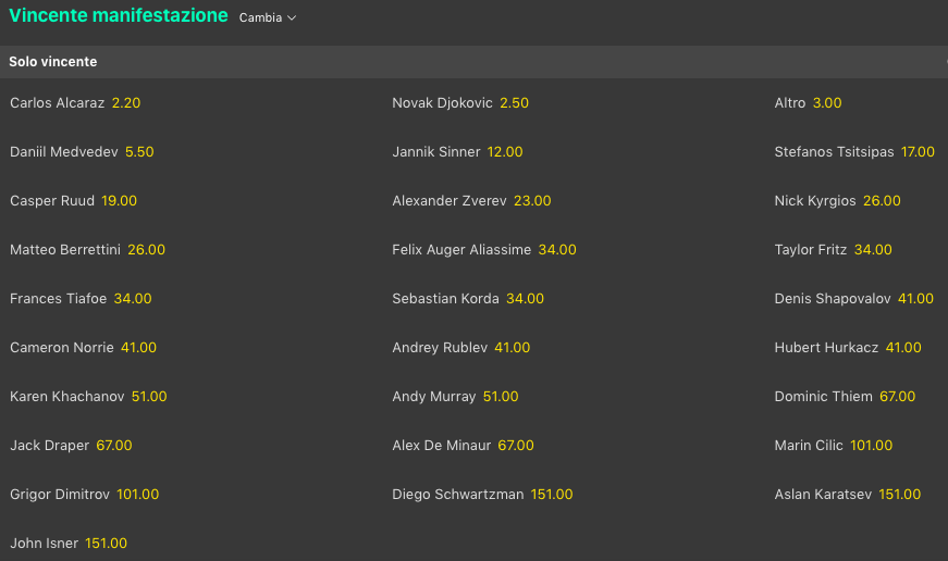 Proverà a fare da terzo incomodo Daniil Medvedev @5.50, che aveva vinto questo torneo nel 2021, mentre Djokovic non vince dal 2018 negli States. Sale leggermente Jannik Sinner da 11 a @12, primo baluardo azzurro mentre Matteo Berrettini rimane stabile @26 volte la posta.
