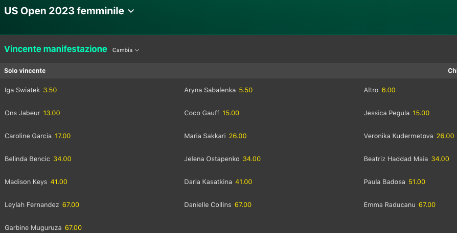 Stabile la favorita in campo femminile, che non è una novità, e si tratta anche della campionessa in carica dello slam americano, Iga Swiantek che rimane fissa @3.50 di quota nonostante la delusione recente a Wimbledon per la numero 1 al mondo, e si avvicina Aryna Sabalenka che passa da 8 alla quota attuale @5.50 che invece ha perso in 3 set contro Ons Jabeur nelle semifinali dello slam su erba inglese. Attenzione anche a Elena Rybakina che cerca il 2° slam in carriera, il primo a Flushing Meadows.
