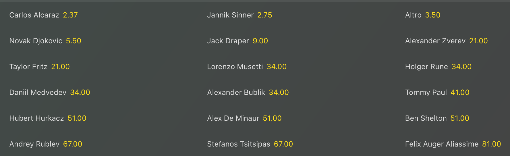 Secondo i bookmakers a scendere in campo con i favori del pronostico sarà Carlos Alcaraz, bi-campione in carica e di poco avanti su Jannik Sinner. Al fianco delle due giovani e nuove stelle del tennis mondiale, c’è l’incognita Novak Djokovic, che sull’erba ha più esperienza di tutti, mentre è un pò più staccato il campione di casa, Jack Draper, che comunque rimane in singola cifra, a differenza di Alexander Zverev che sale @21 volte la posta, assieme a Taylor Fritz. Ancora più indietro Lorenzo Musetti che troviamo @34 volte la posta, in compagnia di Daniil Medvedev, Alexander Bublik ed Holger Rune.