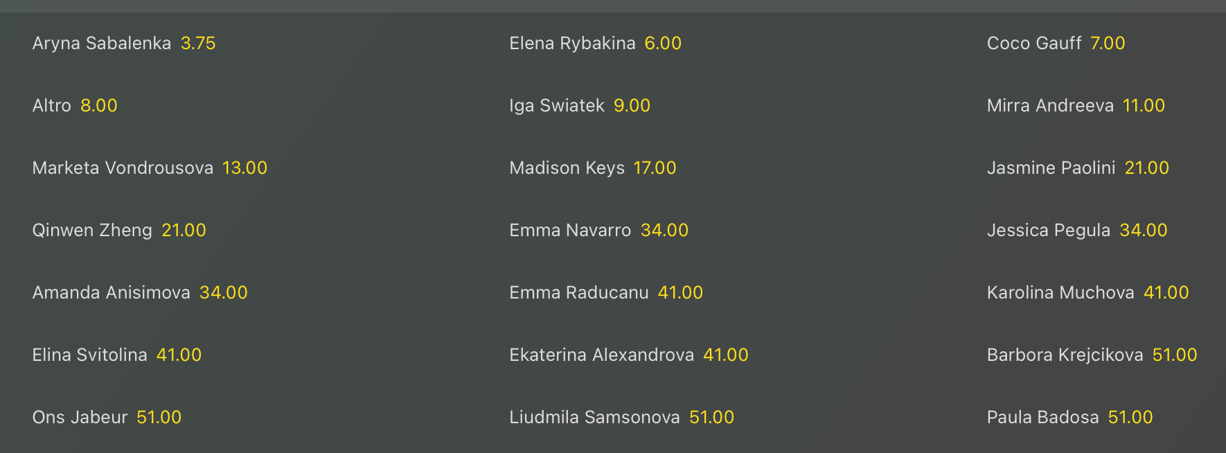 Nel femminile solita sfida tra Aryna Sabalenka ed Elena Rybakina, con Coco Gauff che può sempre inserirsi, ovviamente come Iga Swiatek che è sempre da tenere in considerazione. In seconda fascia troviamo Mirra Andreeva, Marketa Vondrousova e Madison Keys. Ancora più indietro la speranza azzurra, Jasmine Paolini, che si gioca @21 volte la posta per la vittoria a Wimbledon.