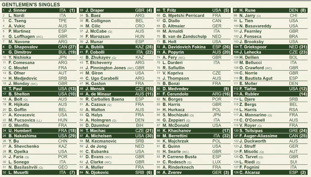 Nella parte bassa finisce invece il campione in carica Carlos Alcaraz, nello stesso lato di tabellone di Alexander Zverev, Taylor Fritz ed Holger Rune. All’esordio Carlitos se la vedrà con il veterano italiano Fabio Fognini, all’ultima volta qui a Wimbledon. Per Alcaraz, sulla carta, cammino tutt’altro che impossibile: la prima testa di serie al terzo turno sarebbe Aliassime, poi uno tra Tsitsipas e Rublev agli ottavi. Il quarto teorico con Rune e in semifinale Zverev.