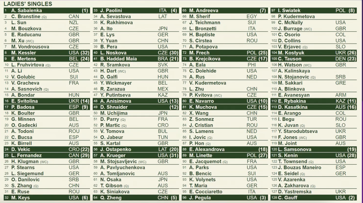 Solo tre le azzurre invece nel tabellone femminile, ma una di questa è la finalista della passata edizione, Jasmine Paolini che è finita nella parte alta del tabellone, quella con Sabalenka, Keys e Zheng. La sua avventura partirà contro la veterana lettone Anastasija Sevastova, mentre l’ottavo teorico dovrebbe essere con Amanda Anisimova, così come i quarti di finale eventuali con la cinese Zheng.