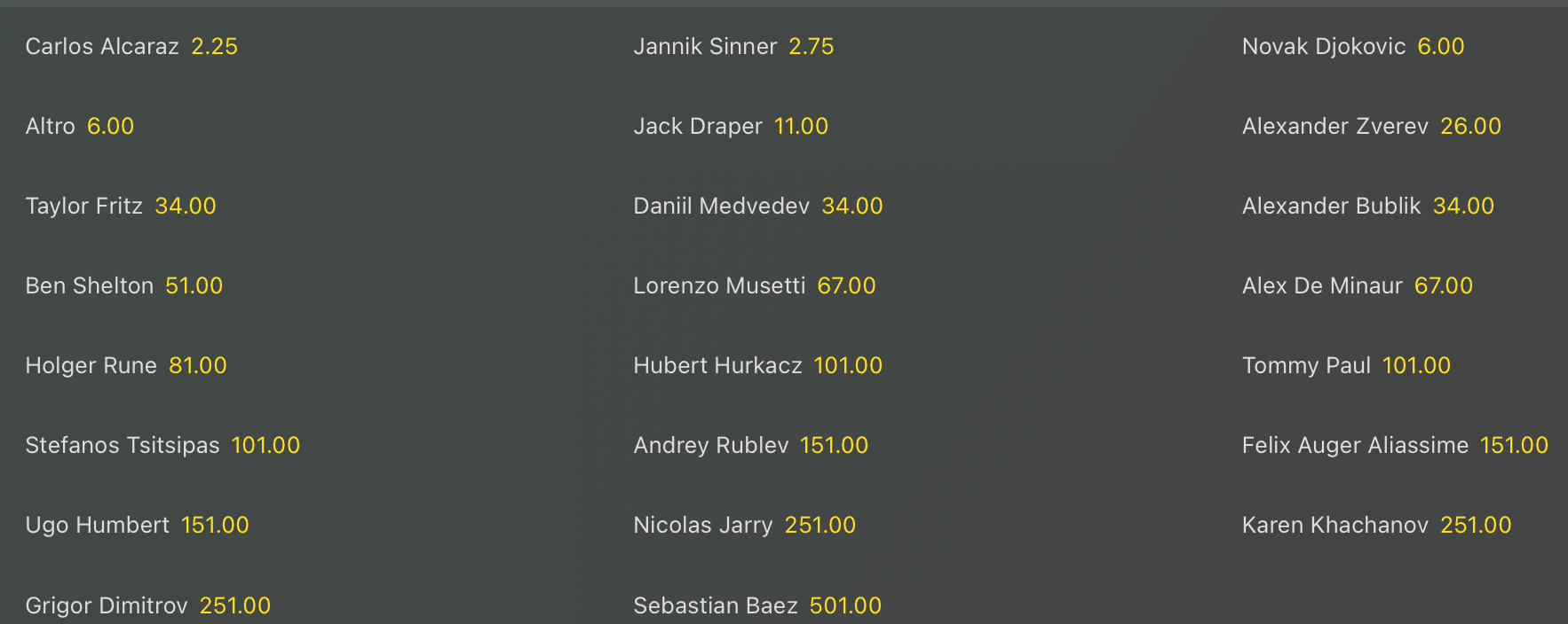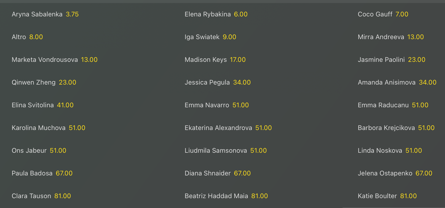 Nel femminile Aryna Sabalenka @3.75 parte avanti ad Elena Rybakina @6.00 e a Coco Gauff @7.00. Scende leggermente la quota di Iga Swiatek @9 che stacca Mirra Andreeva e Marketa Vondrousova, entrambe @13. La nostra Jasmine Paolini @23 è la prima tennista azzurra in lavagna, in seconda fascia per la vittoria finale.